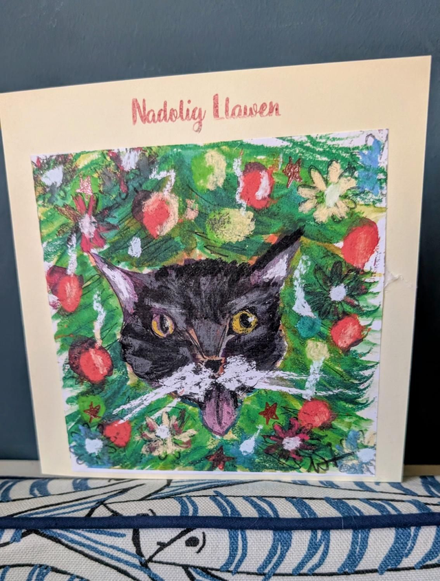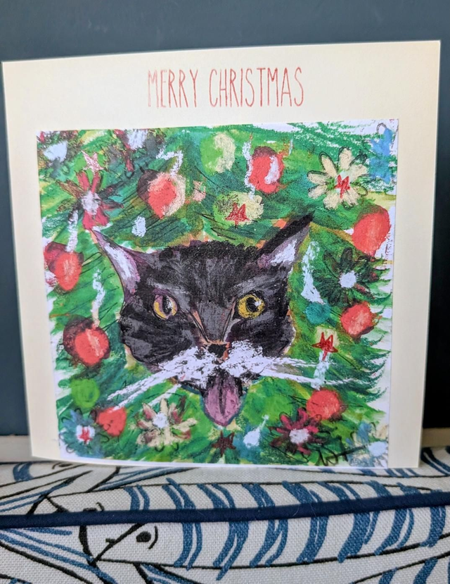 “Handmade 6 x 6” cream card featuring a festive print of Gremlin, the naughty Christmas cat—perfect for adding a playful touch to your holiday greetings.”