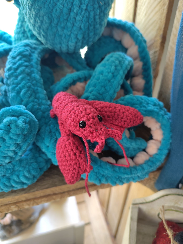 crochet crafts -Hand-Crocheted Lobster Brooch in a Hessian Sack (Approx. 12 cm) Made to Order - allow 1 week craft time