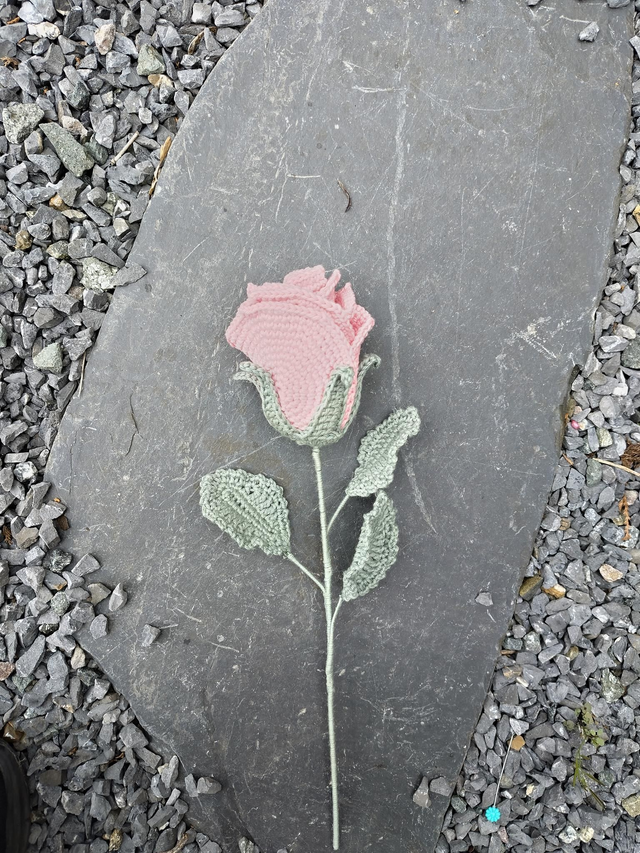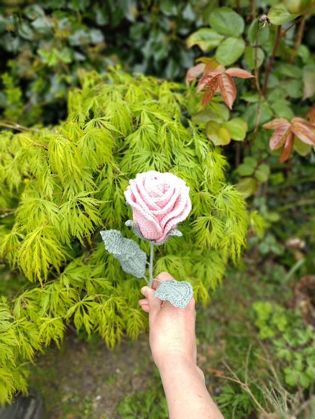 Give the timeless gift of romance with this exquisite hand-crocheted rose bloom single stem.