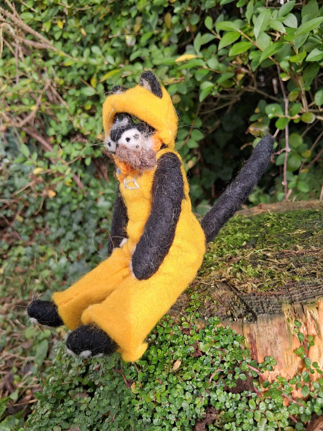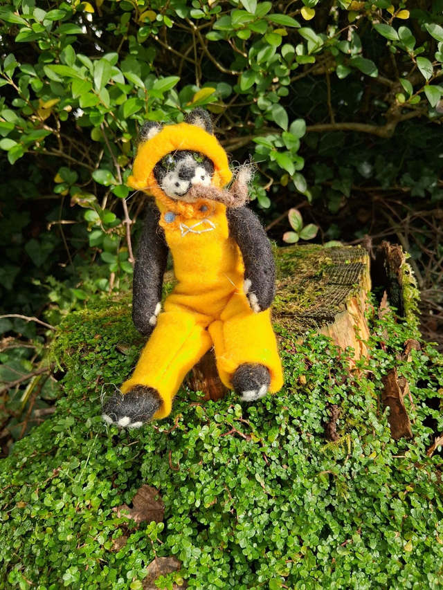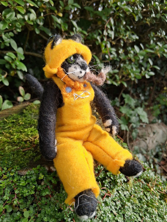 Meet Captain Mackerel, a charming needle-felted art doll inspired by Wendy’s whimsical Creative Cats painting. This handcrafted 3D interpretation brings the beloved character to life with incredible detail and personality. Captain Mackerel is dressed in classic fisherman’s oilskins—bright yellow overalls and a matching sou’wester hat—ready to set sail on his next adventure. With his pipe in hand and endearing black-and-white features, he captures the perfect blend of maritime charm and feline mischief.