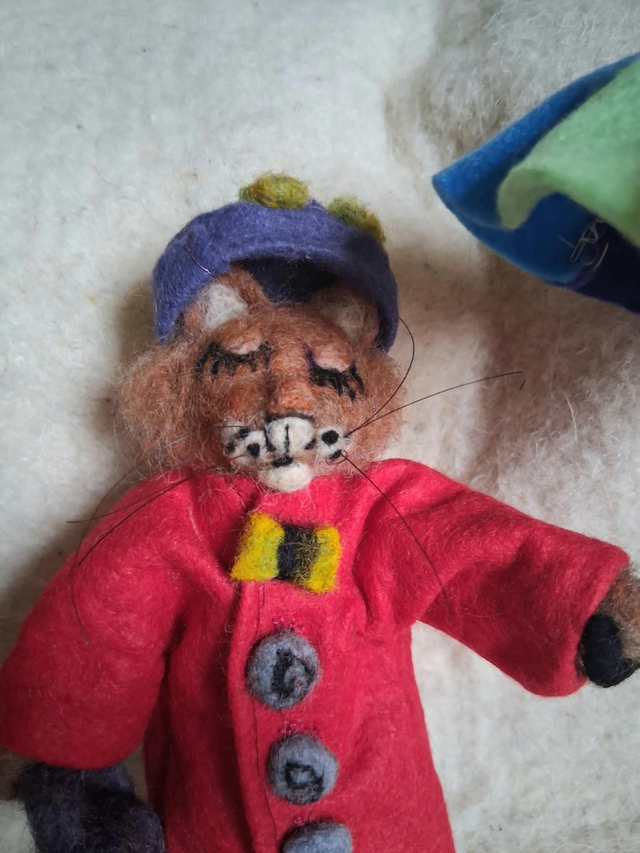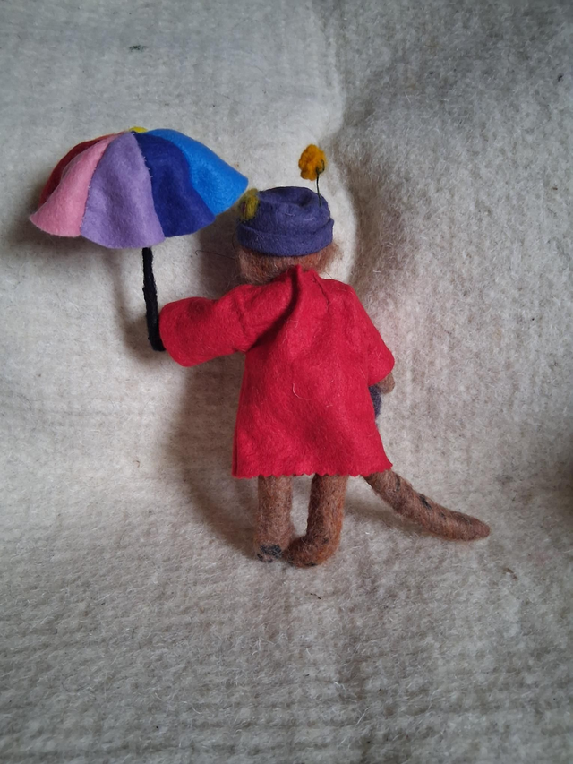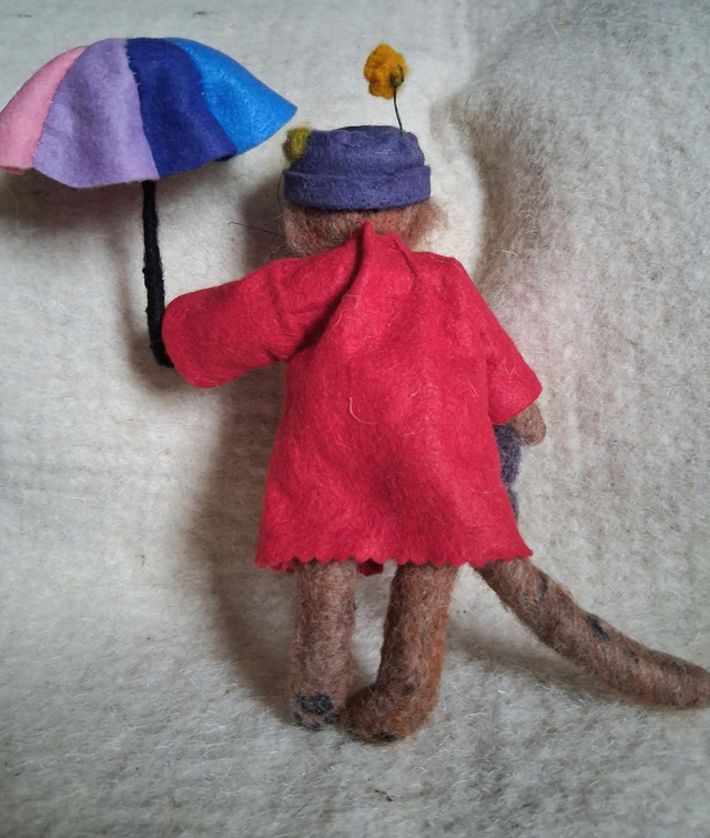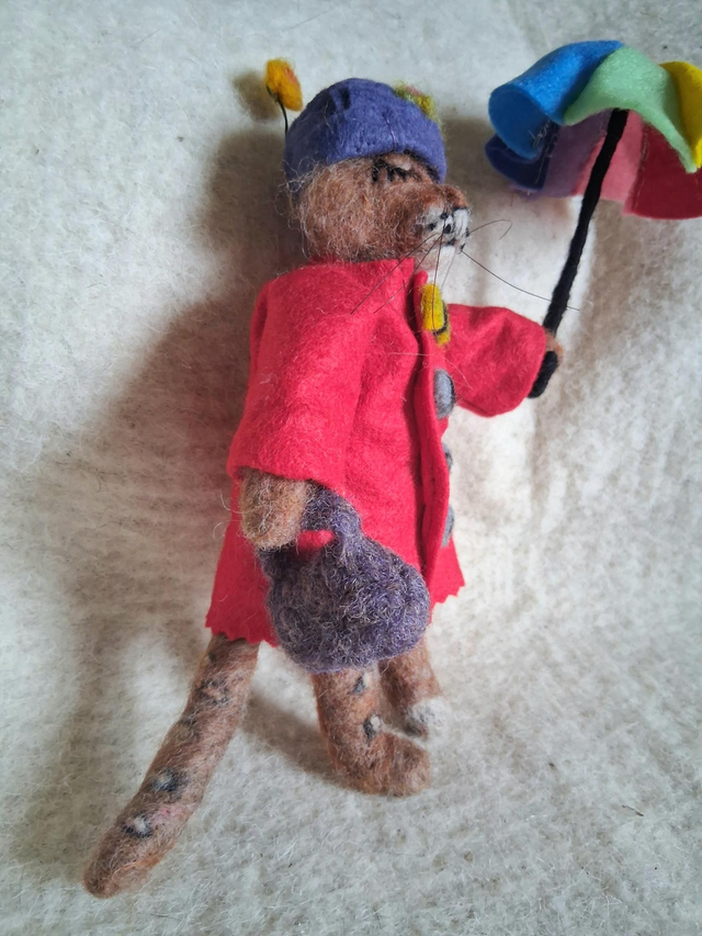 Standing at approx 17cm Cat Poppins is lovingly handmade in pure wool. Her coat and hat are hand tailored to reflect the original artwork including felt buttons and stitched button holes. Her umbrella is wired so that it can be posed. Her clothing and umbrella are made from wool acrylic mix prefelt.